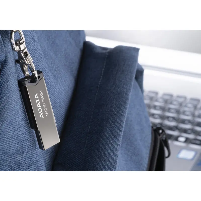 طراحی ADATA UV250 یکی از مهمترین ویژگیهای فلش مموری های ای دیتا محسوب میشود که آن را از بسیاری از رقبا متمایز میکند. این فلش مموری بدنهای تمام فلزی دارد که علاوه بر ظاهری شیک و مدرن، مقاومت بیشتری در برابر خط و خش و ضربههای جزئی فراهم میآورد. فلز براق استفادهشده در ساختار آن باعث میشود هنگام استفاده روزمره همچنان جلوهای نو و حرفهای داشته باشد. ابعاد این فلش مموری 4.2 × 1.4 × 0.5 سانتیمتر و وزن آن تنها 5.6 گرم است که آن را به مدلی سبک و فوقالعاده قابلحمل تبدیل کرده است. به راحتی در جیب یا کیف جای میگیرد و به دلیل وزن پایین، هنگام اتصال به لپتاپ یا دستگاههای دیگر هیچ فشاری به پورت وارد نمیکند. یکی دیگر از نکات مثبت طراحی این مدل، حذف درپوش جداگانه است. بسیاری از کاربران تجربه گم کردن درپوش فلش مموریها را دارند، اما طراحی بدون درپوش UV250 این مشکل را بهطور کامل برطرف کرده است. کانکتور فلش درون بدنه محافظت میشود و همیشه آماده اتصال است. همچنین، ای دیتا در بخش انتهایی فلش یک سوراخ مخصوص بند طراحی کرده است. این قابلیت امکان اتصال فلش به جاکلیدی یا بند گردنی را فراهم میکند و باعث میشود در سفر یا استفاده روزمره امنیت بیشتری داشته باشد.