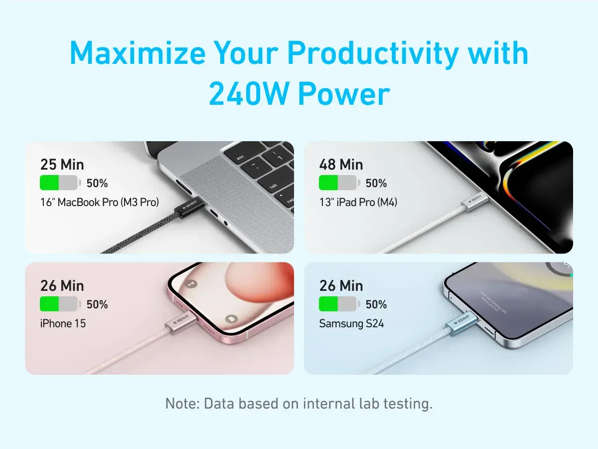 در صورت سازگاری لپتاپ با شارژ USB-C، این کابل با توان 240 وات میتواند استفاده شود.